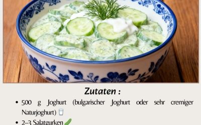🛒 Zutaten (mit Alternativen): 500 g Joghurt (bulgarischer Joghurt oder sehr cremiger Naturjoghurt) 🥛 2–3 Salatgurken 🥒 3–4 Knoblauchzehen…