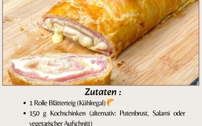 ✨ Zutaten (mit Alternativen) 1 Rolle Blätterteig (Kühlregal) 🥐 150 g Kochschinken (alternativ: Putenbrust, Salami oder vegetarischer Aufschnitt)…