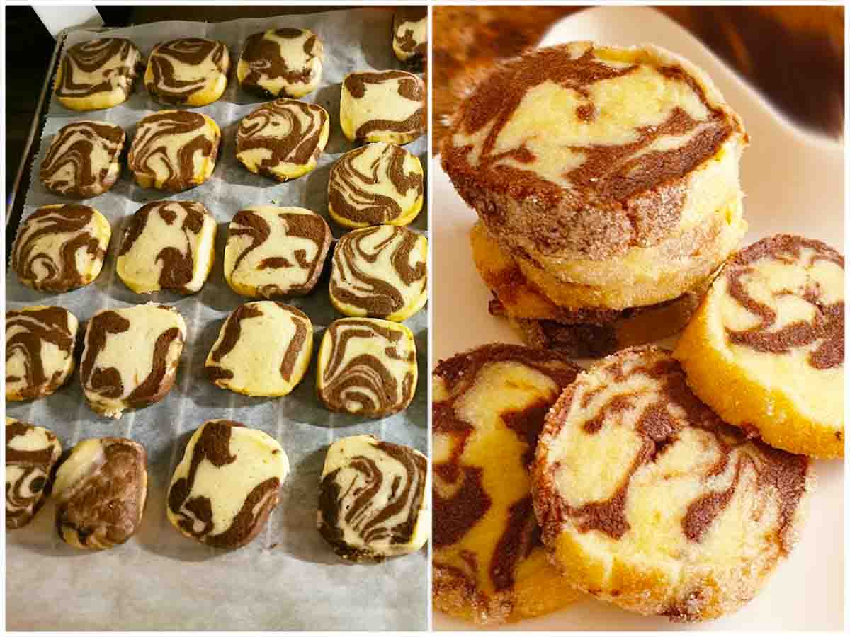 Die Rollen in je 20 Scheiben schneiden und auf ein mit Backpapier ausgelegtes Backblech legen.