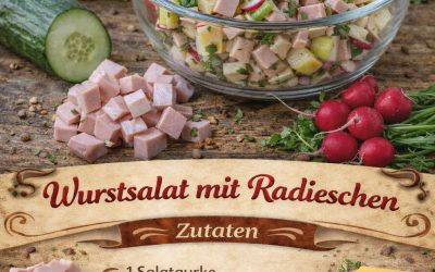 Zutaten 1 Salatgurke(n) 650 g Fleischwurst 250 g Gouda oder Emmentaler 1/2 Bund Radieschen 1 Zwiebel(n) 1 Tasse/n Brühe, klare…