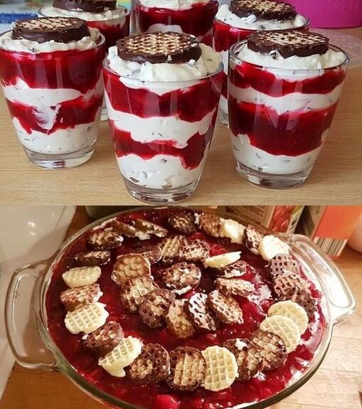 Deko: etwas Rote Grütze, frische Beeren, Schokokuss‑Hälften