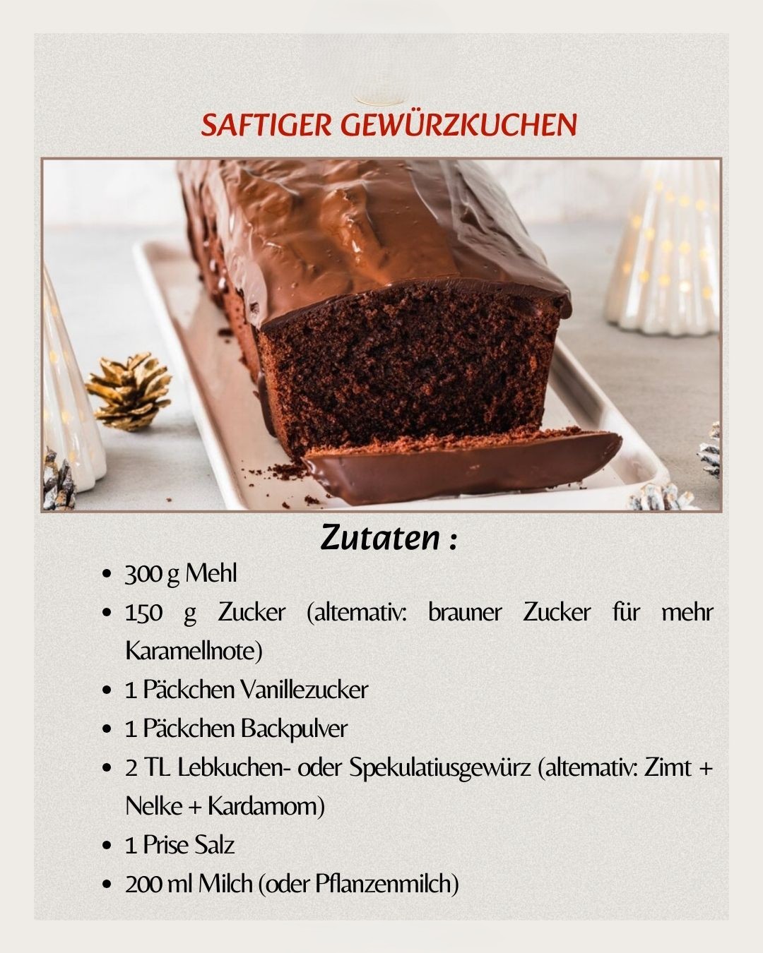 2 TL Lebkuchen- oder Spekulatiusgewürz (alternativ: Zimt + Nelke + Kardamom)