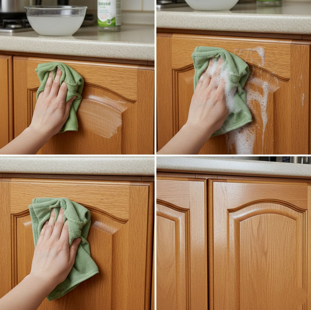 Diese Kombination entfernt Fett gründlich, ohne Lack, Holz oder Farbe zu beschädigen. Für zusätzlichen Glanz können Sie anschließend eine kleine Menge Mineralöl auftragen – das pflegt das Holz und lässt es wie neu aussehen.